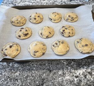 - Form cookie dough into 1 1/2 to 2 inch balls (yes these are big cookies) on a cookie sheet covered in parchment paper